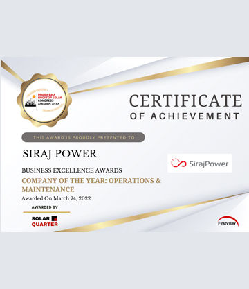 SirajPower has won the 'Company of the Year: Operations & Maintenance' award at the Middle East Rooftop Solar Congress Awards-2022