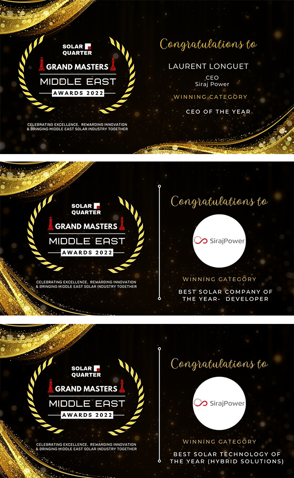 The awards were for the 'Best Solar Company of the Year’, 'Best Solar Technology of the Year’ for SirajPower Hybrid Solutions, and the 'CEO Of the Year' awarded to SirajPower's CEO, Laurent Longuet. More than 100 industry leaders from across the region attended the ceremony.