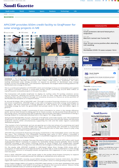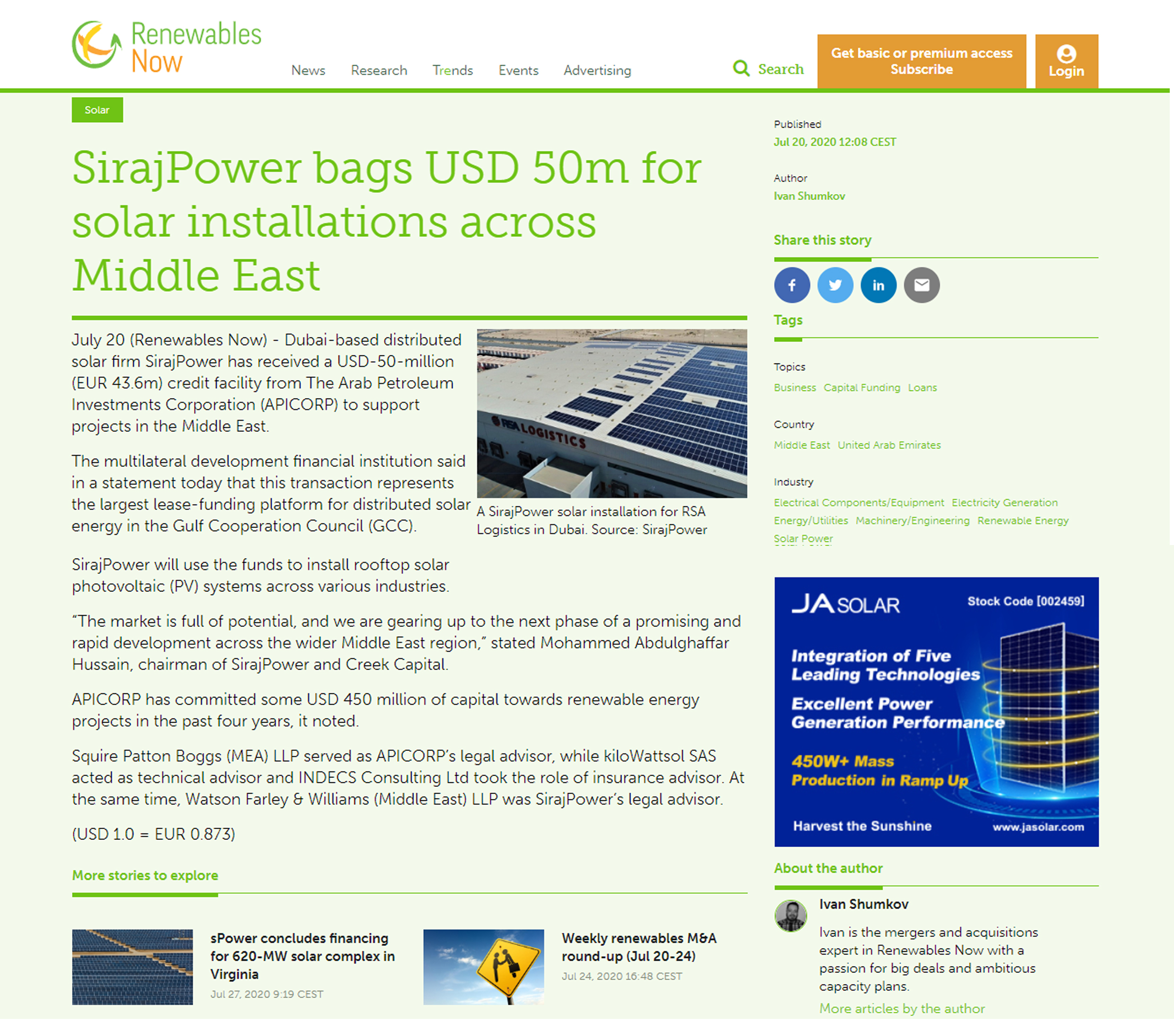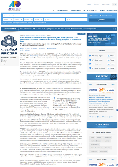 APICORP provides USD 50m credit facility to SirajPower for solar energy projects in the Middle East