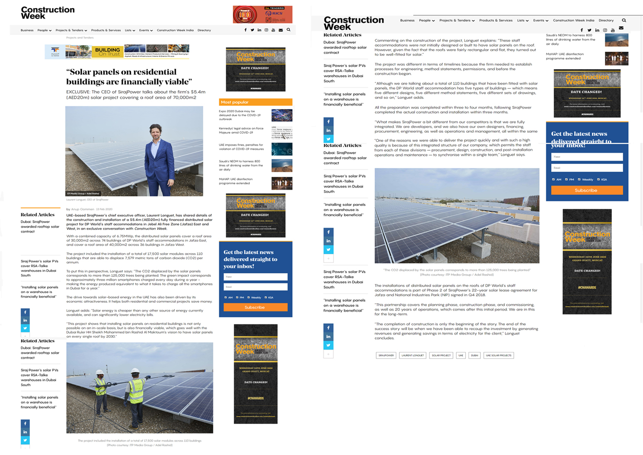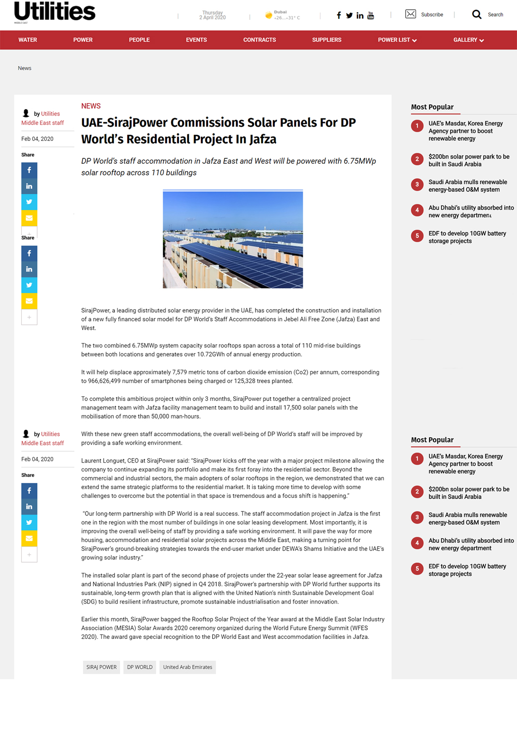 SirajPower commissions Solar Panels for DP World’s Residential Project in Jafza