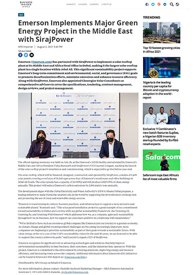Emerson Implements Major Green Energy Project in the Middle East with SirajPower