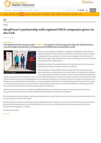 UAE distributed solar energy provider SirajPower has signed a solar leasing partnership with Ajmal Perfumes, one of the largest manufacturers of fragrances in the Middle East and around the world.